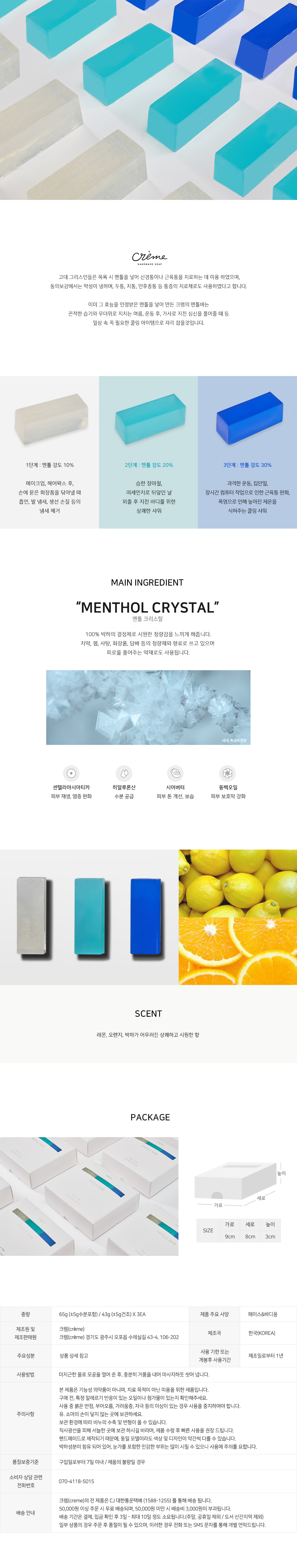 멘톨을 넣어 만든 크렘의 멘톨바는 끈적한 습기와 무더위로 지치는 여름, 운동 후, 가사로 지친 심신을 풀어줄 때 등 일상 속 꼭 필요한 쿨링 아이템으로 자리 잡을 것입니다.