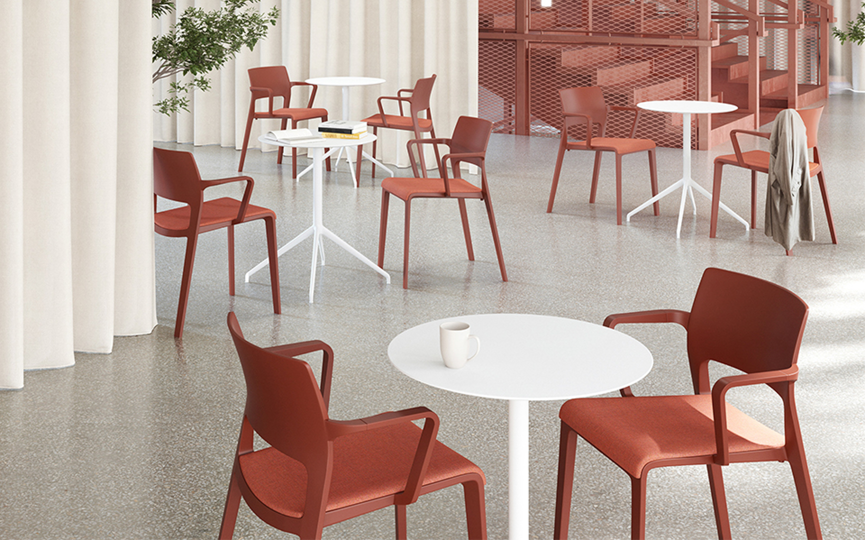 Juno 02 Chair는 지속 가능한 플라스틱 소재를 사용하였으며 자연 세계에서 영감을 얻은 컬러로 만들어졌습니다.