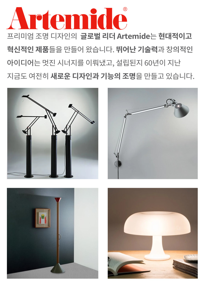Tolomeo는 Michele De Lucchi와 Giancarlo Fassina가 디자인한 조명 컬렉션입니다. 유려한 비례와 효율적인 공간 차지, 뛰어난 실용성으로 잘 알려져 있습니다. 아노다이징 도색된 알루미늄 재질로 뛰어난 내구성을 자랑합니다. 마이크로, 미니, 클래식 세 가지의 사이즈로 제작되어 사용하고자 하는 공간에 맞게 선택 가능합니다.